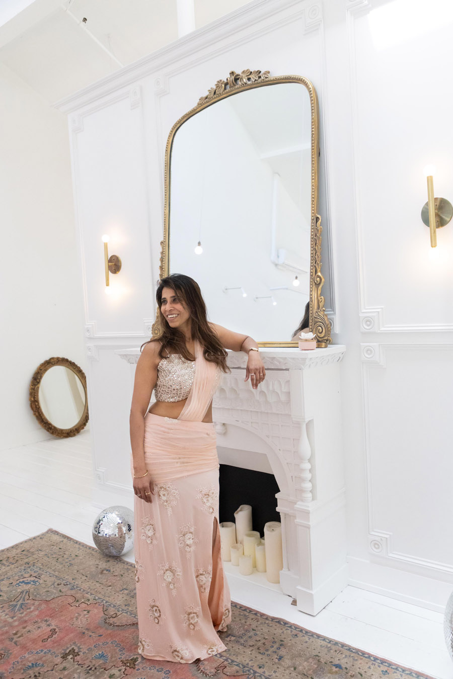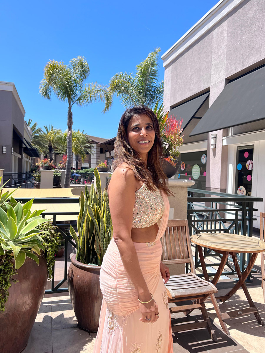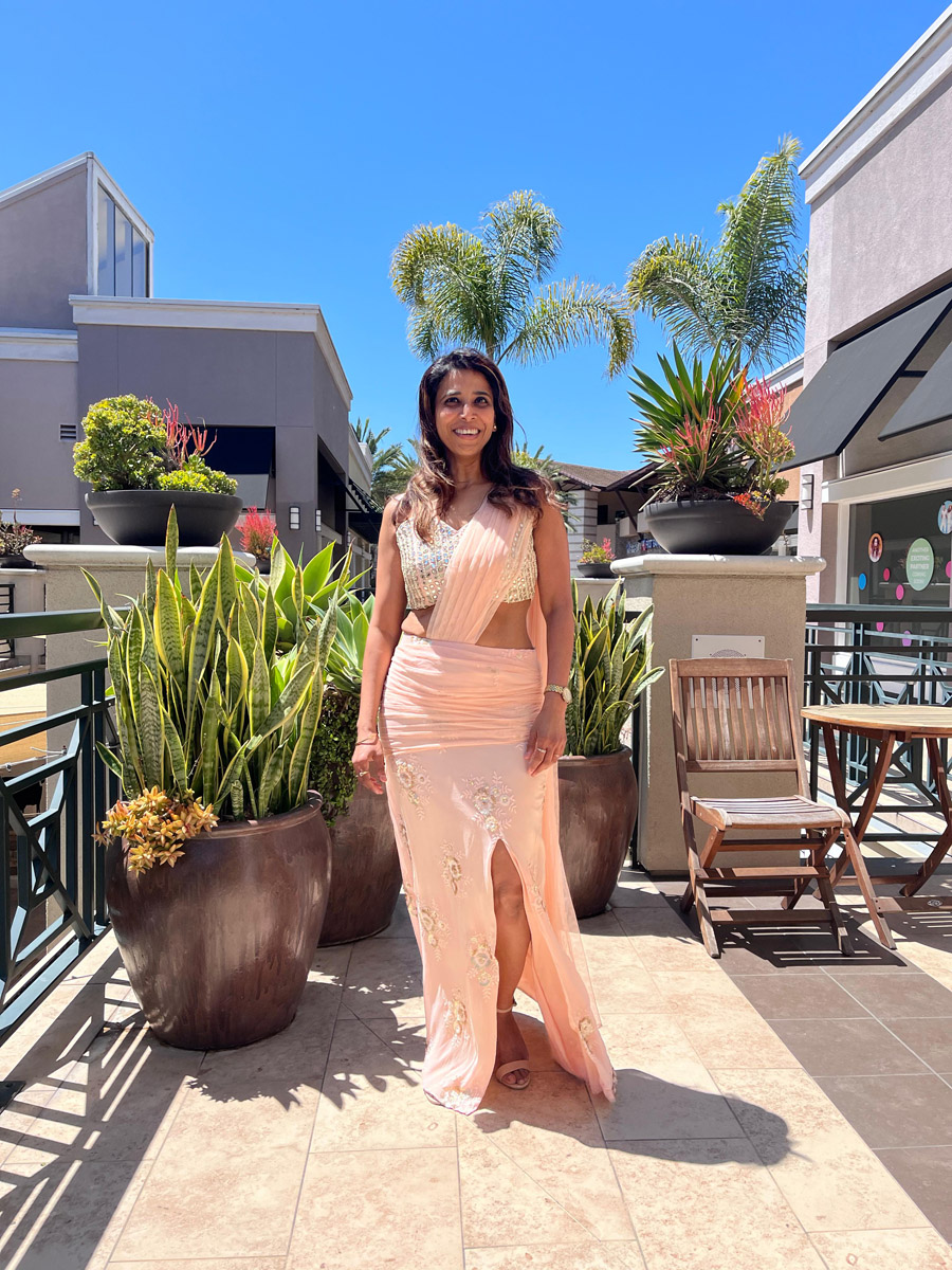 Powder Pink floral Sequin and Thread work pre-draped saree with a slit and attached tulle pallu. The look is complete with Mirror and Pearl Hand embroidered bustier.